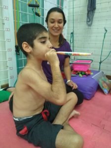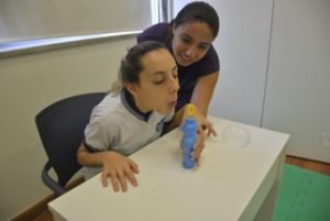 Em uma garrafa ou copo, coloque agua o suficiente para não transbordar. Com um canudo peça para a criança assoprar fazendo bolhas na agua o máximo que conseguir. Essa atividade também faz com que a pressão gerada dentro do pulmão pela oscilação da agua auxilie na mobilização de secreções.