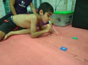 Faça bolinhas pequenas de papel, improvise as traves do gol e comece o jogo. A criança precisa controlar o assopro para poder acertar o gol e trabalhar também os músculos inspiratório e inspiratórios.